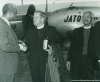 churchawakens441 Cyril E. King, Virgin Island Government Secretary (left), and the Rt. Rev. Cedric Earl Mills (right) welcome Presiding Bishop Hines (center) to St. Thomas, Virgin Islands, c. 1970.