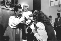 churchawakens417 Bishop Harris confirms a member of the Church of St. Stephen in downtown Boston during her first year as suffragan bishop of the Diocese of Massachusetts, 1989.