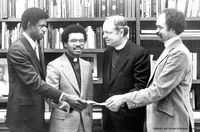 churchawakens494 "Save the Children Weekend" receipts were presented to Presiding Bishop John M. Allin of the Episcopal Church for the Presiding Bishop's Fund for World Relief for world hunger. Designated to purchase two irrigation pumps for drought victims in Niger through Africare. Shown above (left to right) are Vaughn Simkins, youth coordinator of St. Cyprian's; the Rev. Richard L. Tolliver, rector; Bishop Alin ; and Robert Thornell, chairman of the church's world hunger committee.