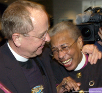 churchawakens419 Bishop Barbara Harris, retired Suffragan Bishop of Massachusetts, greeting Gene Robinson before his consecration service, November 2, 2003.