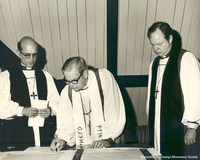 churchawakens459 The Reverend Duncan Montgomery Gray, Jr. (left), Presiding Bishop John Hines (center), and Bishop of Mississippi John Allin (right) at Gray's consecration as bishop coadjutor, 1974.