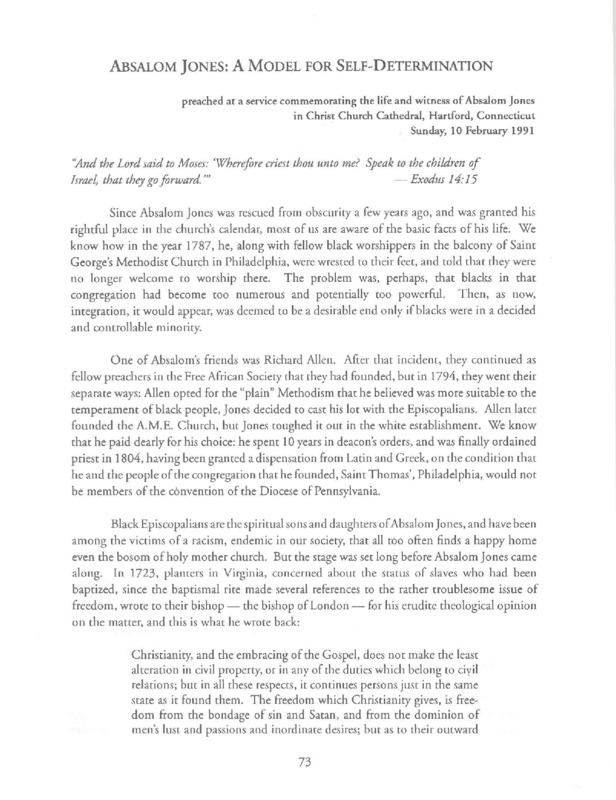 - Sermon written and preached by The Reverend Canon Harold T. Lewis commemorating the life of Absalom Jones, June 1991.