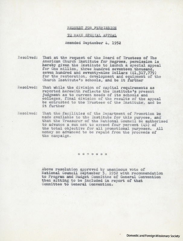 - In 1952, the Board of Trustees of ACIN submitted a request for approval to make a special appeal for $1,317,779 to facilitate restoration work with the ACIN schools. Executive Council Resolution approved the resolution on September 5, 1952.