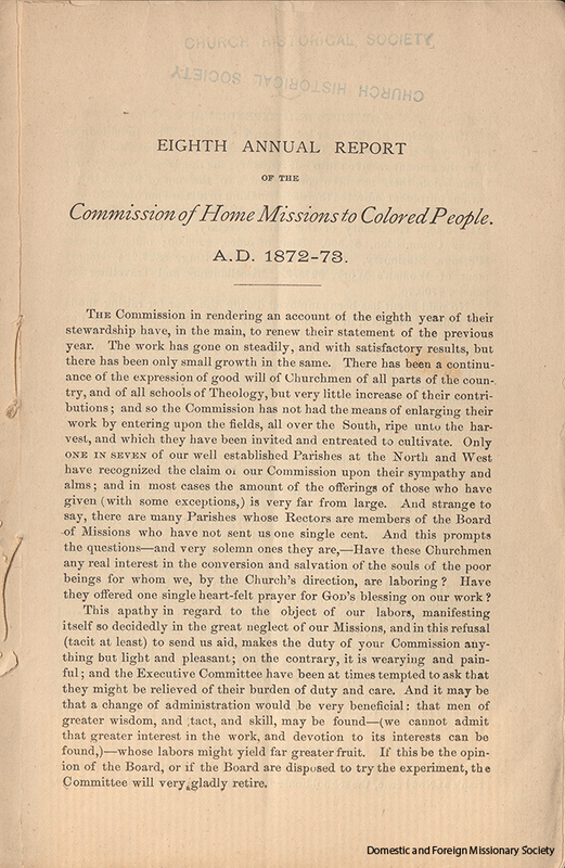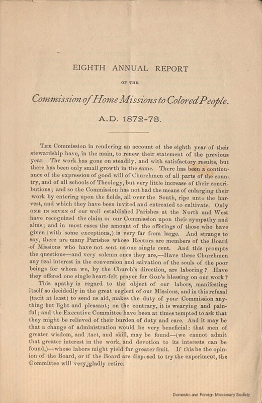 - Eighth Annual Report of the Commission Home Missions to Colored People, 1872-1873.