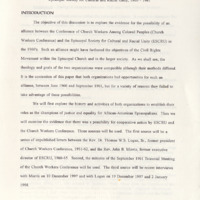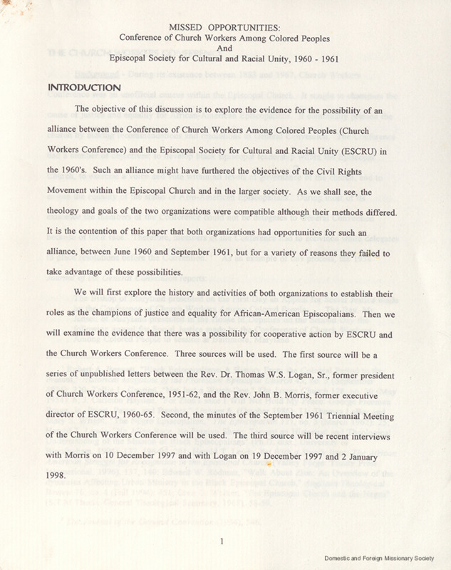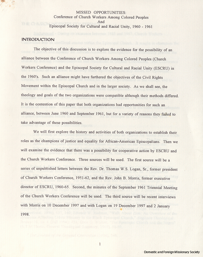 - Manuscript detailing the events occurring between the Conference of Church Workers Among Colored Peoples and the Episcopal Society for Cultural and Racial Unity, 1960-1961.