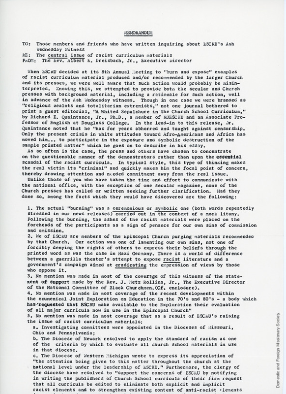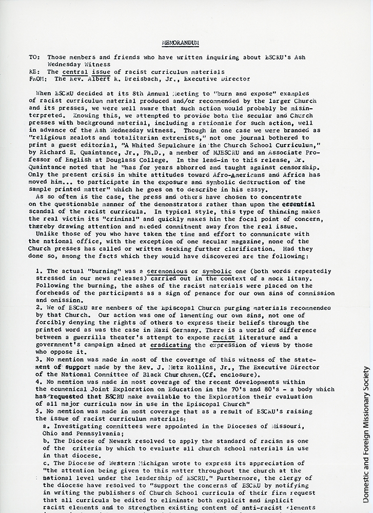 - ESCRU responds to objections regarding the Ash Wednesday Book Burning and explains its actions, 1969.