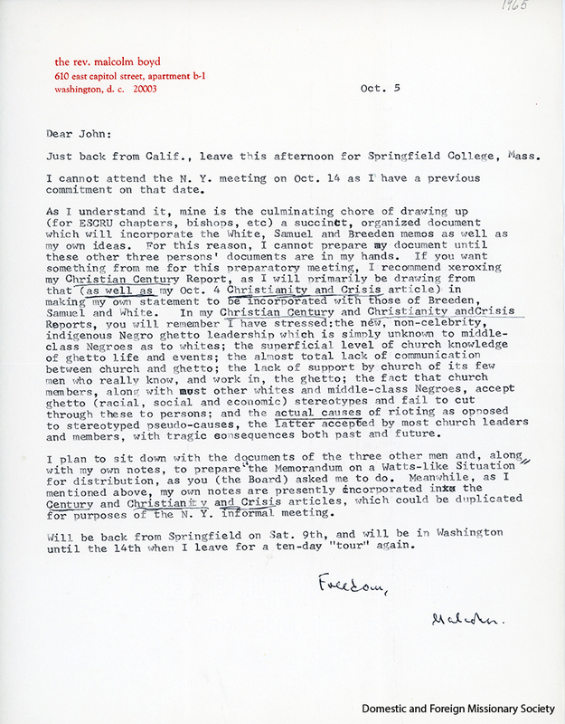 - Letter from Malcolm Boyd to John Morris regarding Watts riot response, 1965.