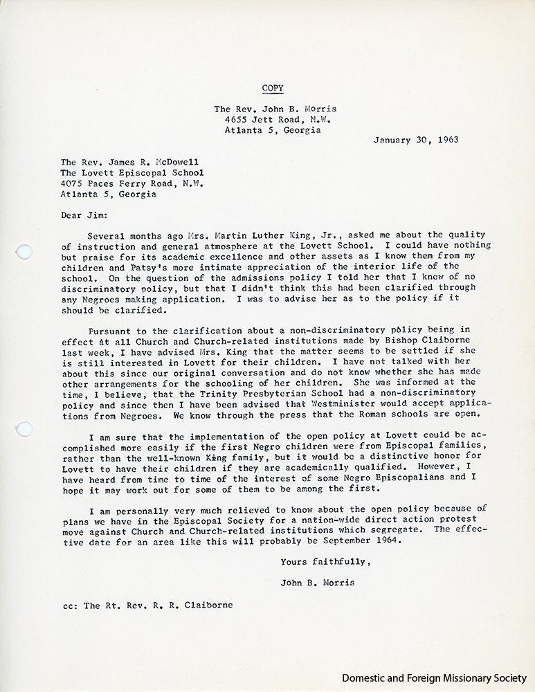 - Letter from John Morris to Rev. James McDowell, the headmaster at Lovett School, 1963.