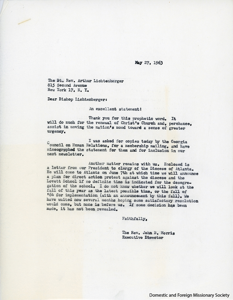- Letter from Rev. John Morris to Presiding Bishop Lichtenberger applauding his statement on segregation, 1963.