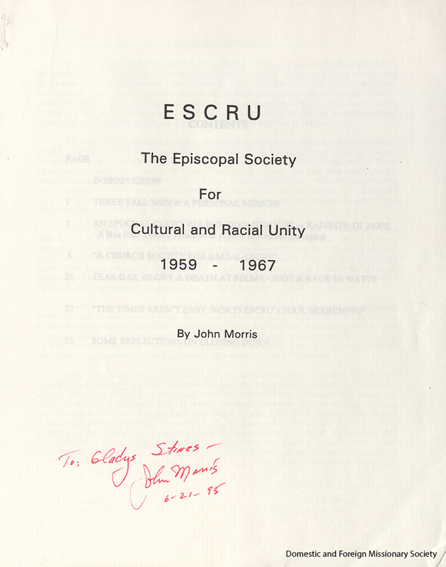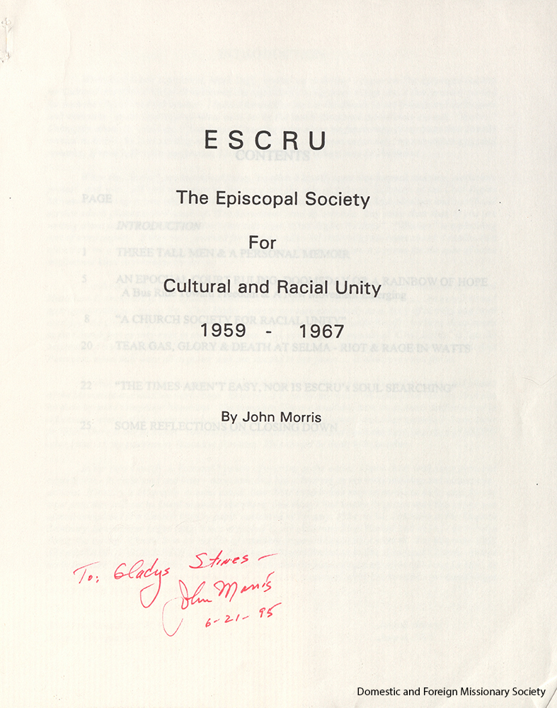 - A history of The Episcopal Society for Cultural and Racial Unity, 1959-1967, written by Rev. John Morris, 1995.