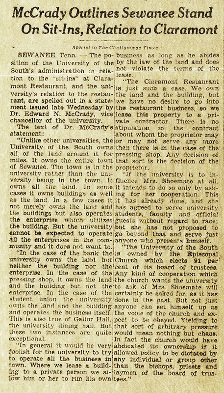 - An article written by Sewanee Chancellor Dr. Edward N. McCrady outlining Sewanee's position on the sit-in at the Claramont Restaurant, 1962.