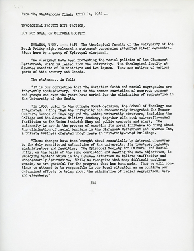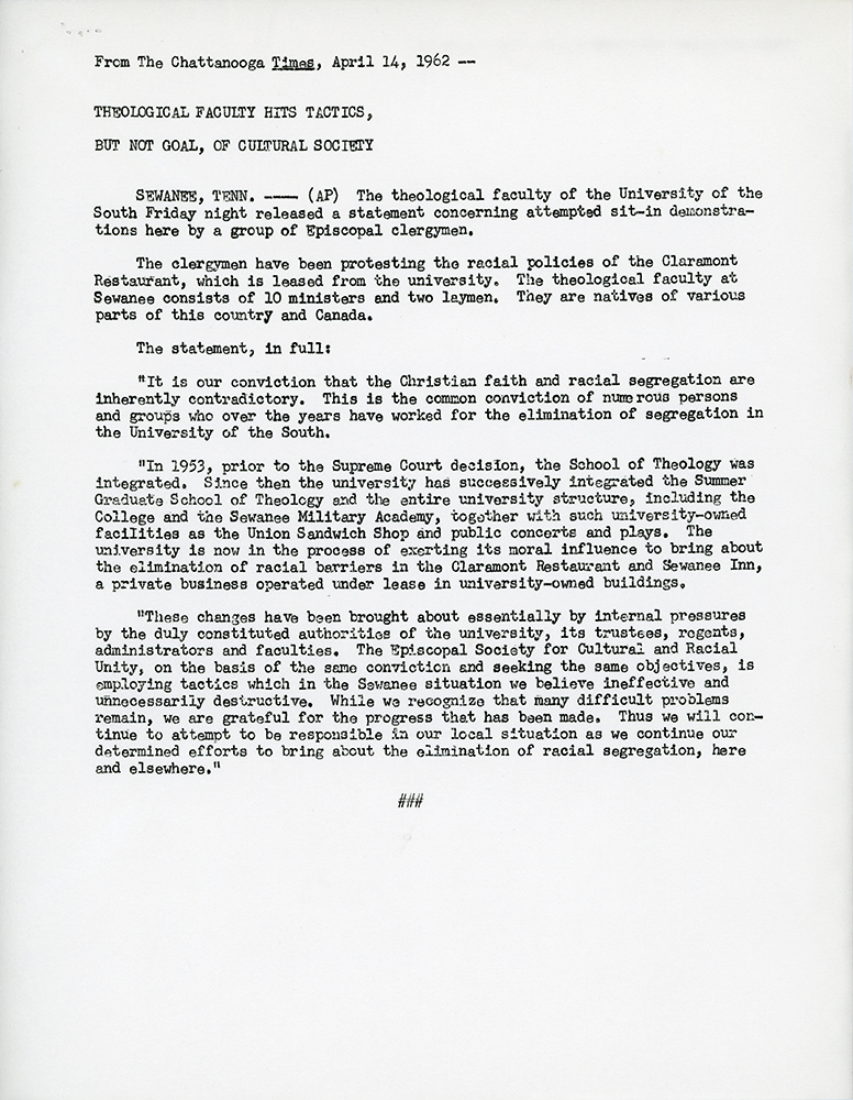 - Sewanee Statement in Response to Sit-In, 1962.
