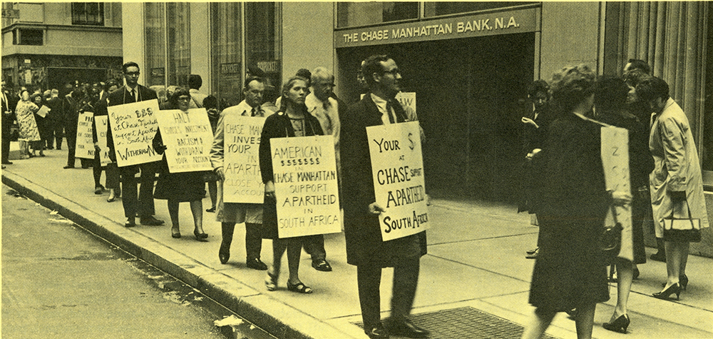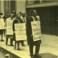 - A demonstration, sponsored by the Committee of Conscience Against Apartheid, held in front of Chase Manhattan Bank as part of the continuing campaign for withdrawal of accounts due to Chase’s direct financial support to the government of South Africa, 1966.