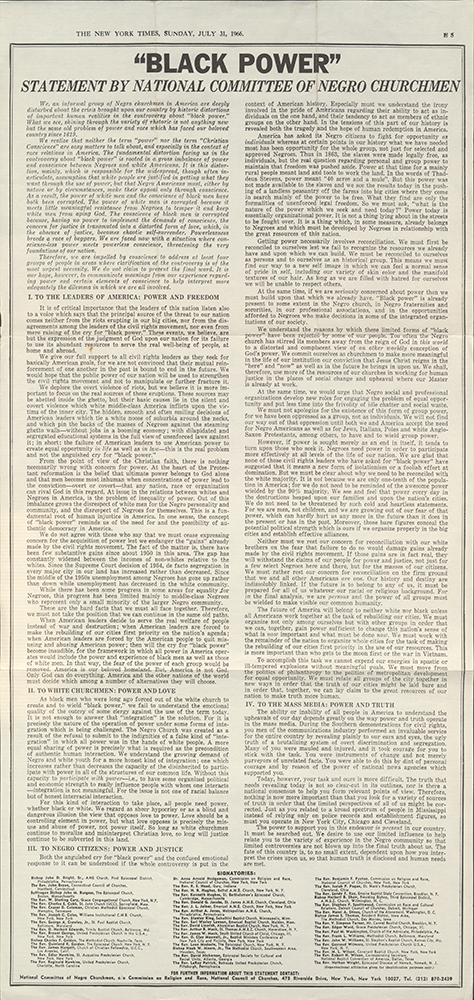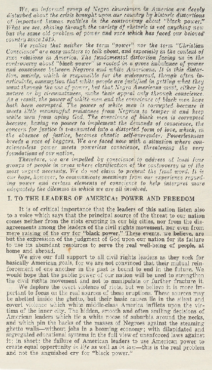 - Statement by the National Committee of Negro Churchmen, published in the New York Times, July 31, 1966.