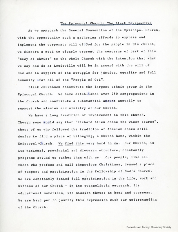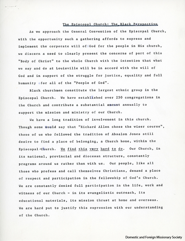 - A position paper drafted by Rev. Joseph Green for the 64th General Convention titled “The Episcopal Church: The Black Perspective,” 1973.