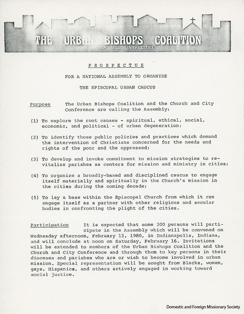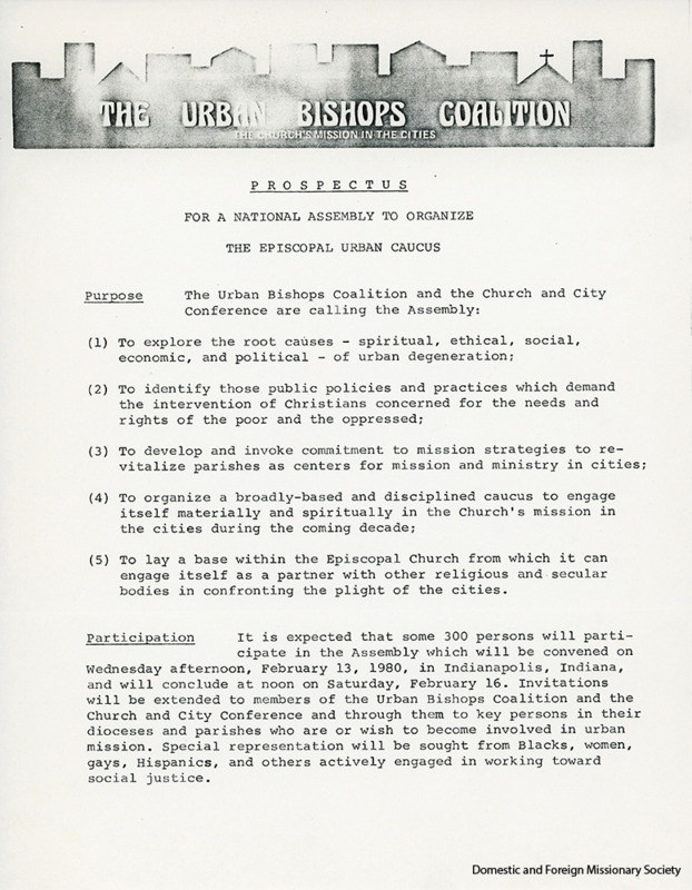 - Prospectus for a National Assembly to Organize the Episcopal Urban Caucus, undated.