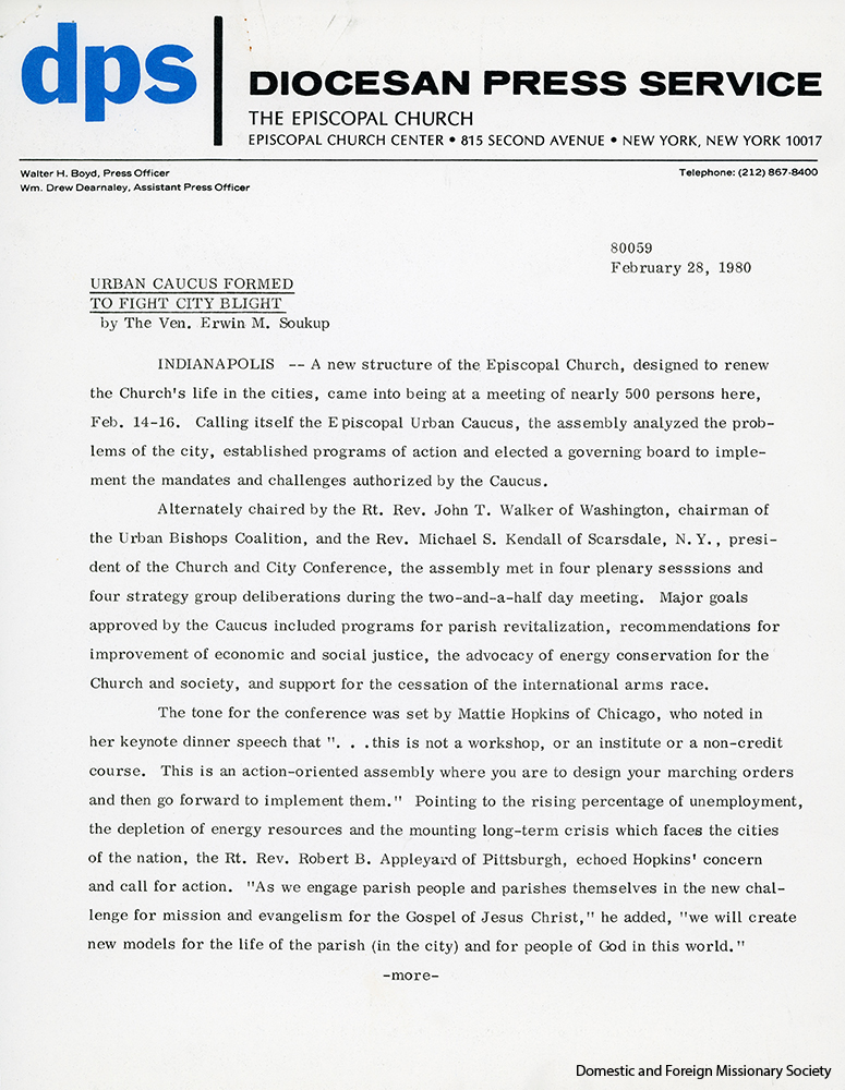 - "Urban Caucus Formed to Fight City Blight" Diocesan Press Service, 1980.