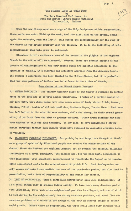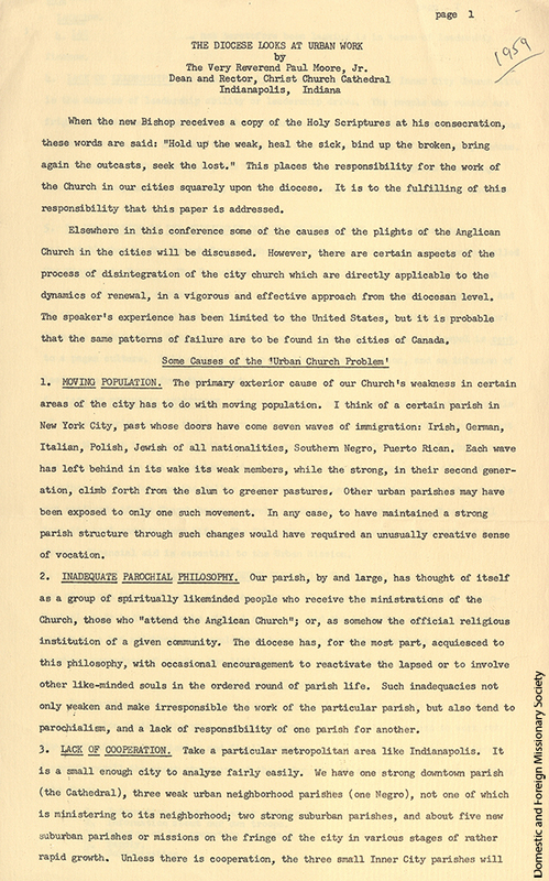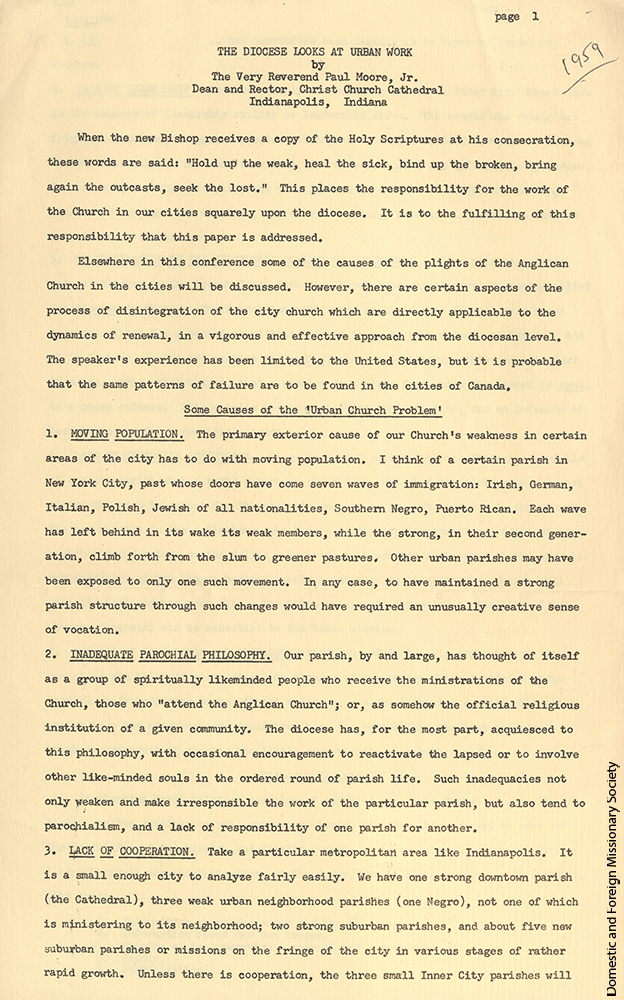 - Statement by Bishop Paul Moore Jr., identifying challenges in urban church work, 1959.