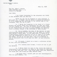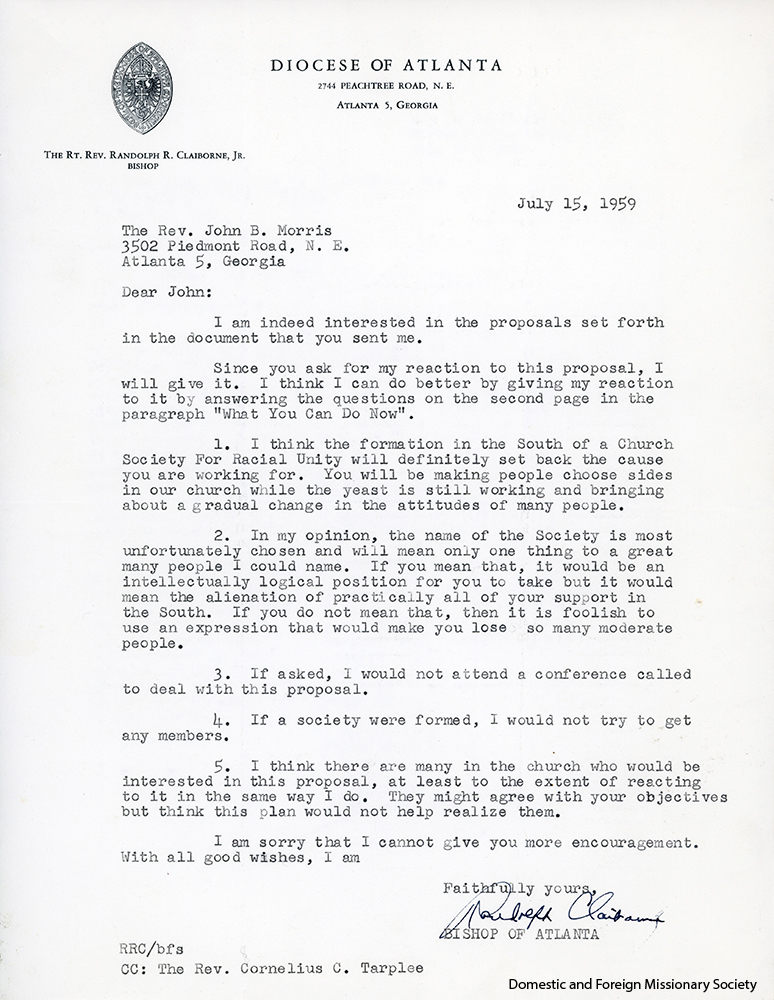- Letter written to ESCRU Director John Morris from the Rt. Rev. Randolph R. Claiborne, Jr., Bishop of Atlanta, expressing his lack of support for ESCRU, July 1959.