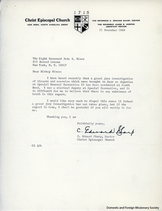 - Letter from Sharp to Hines regarding the General Convention Special Program subpoena for a Federal Grand Jury, November, 1969.