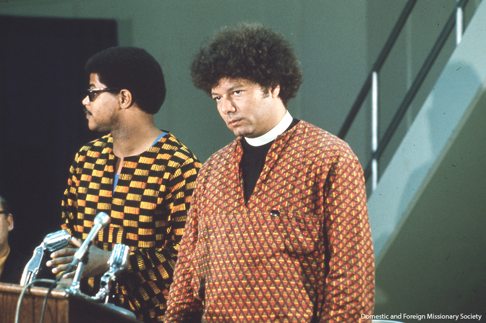 - Muhammed Kenyatta, civil rights activist and organizer for the Student Nonviolent Coordinating Committee (SNCC), at left, and the Reverend James E. P. Woodruff at the Special General Convention, 1969.
