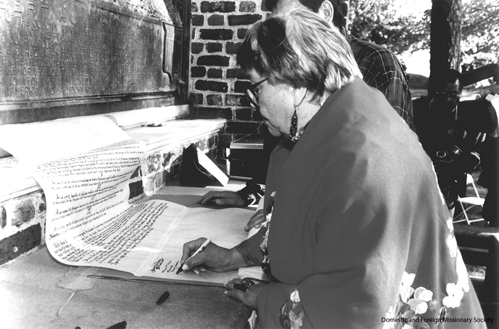 - Owanah Anderson, a Choctaw from Oklahoma and director of Native American Ministries, signs the New Jamestown Covenant, the church’s new covenant with Indigenous people, November 1997.