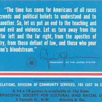 - Poster produced by ESCRU featuring President Lyndon B. Johnson’s position on racism, c. 1968.