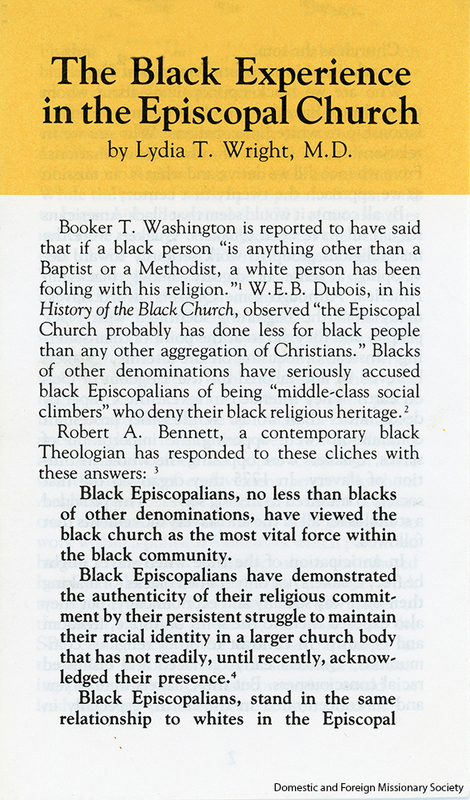 - The Black Experience in the Episcopal Church, a Forward Movement Publication, written by Lydia T. Wright, 1986.