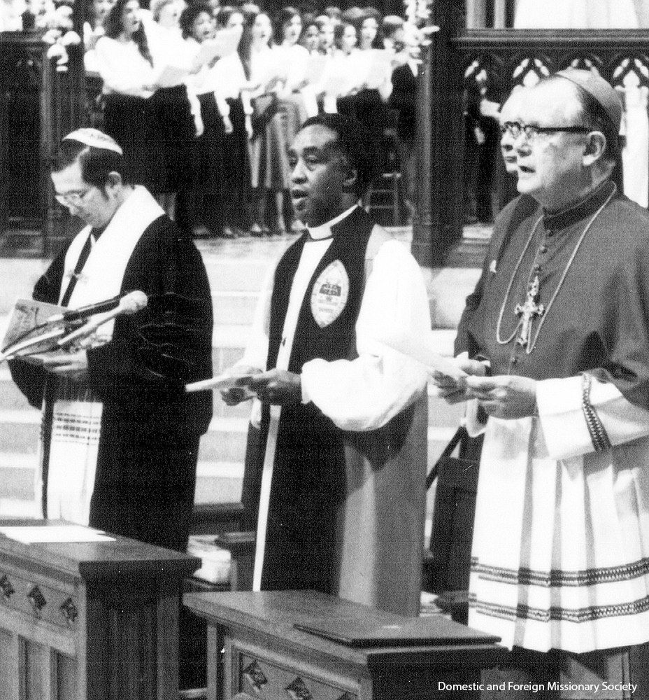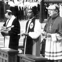 - Clergy gathered in Washington Cathedral for a special service of thanksgiving for the 53 Americans freed from the Iran hostage crisis. Pictured, left to right, Rabbi Mendel Abrams, Bishop John T. Walker, and Roman Catholic Archbishop James E. Hickey.