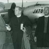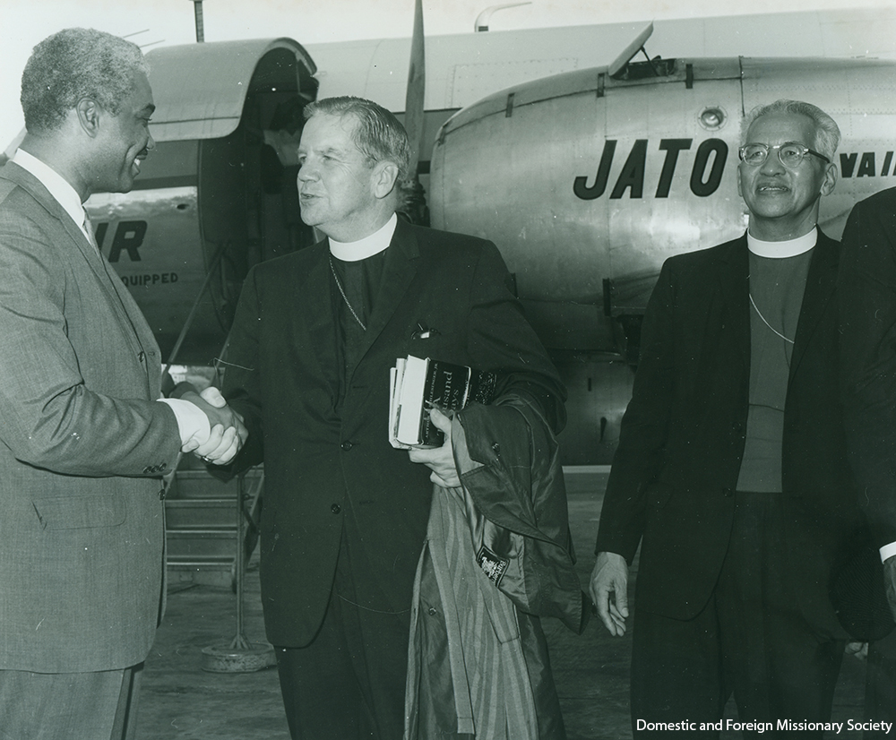 - Cyril E. King, Virgin Island Government Secretary (left), and the Rt. Rev. Cedric Earl Mills (right) welcome Presiding Bishop Hines (center) to St. Thomas, Virgin Islands, c. 1970.