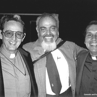 - Dr. Charles Lawrence, President of the House of Deputies, is greeted by the Rt. Rev. Emilio Hernandez (left), the Bishop of Cuba, and the Rev. Juan Ramon Lopez (right), vicar-general, during his visit to Havana with a Church World Service delegation, 1983.