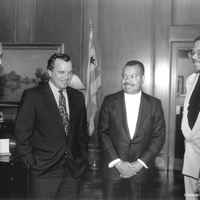 - The Rev. Canon Harold Lewis (second from right) and Presiding Bishop Edmond Browning (right) visit with Chicago Mayor Richard Daley (left center) and two local clergy, the Rev. Martini Shaw (left) and the Rev. Richard Tolliver (center), 1992.