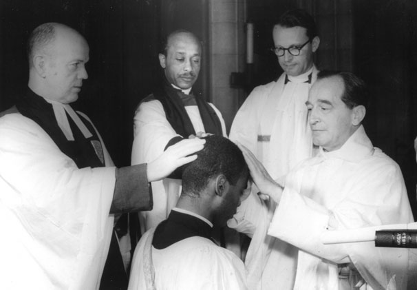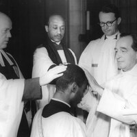 - Tollie Caution (center) looks on as Bishop Donegan ordains the young Walter Dennis, 1958.