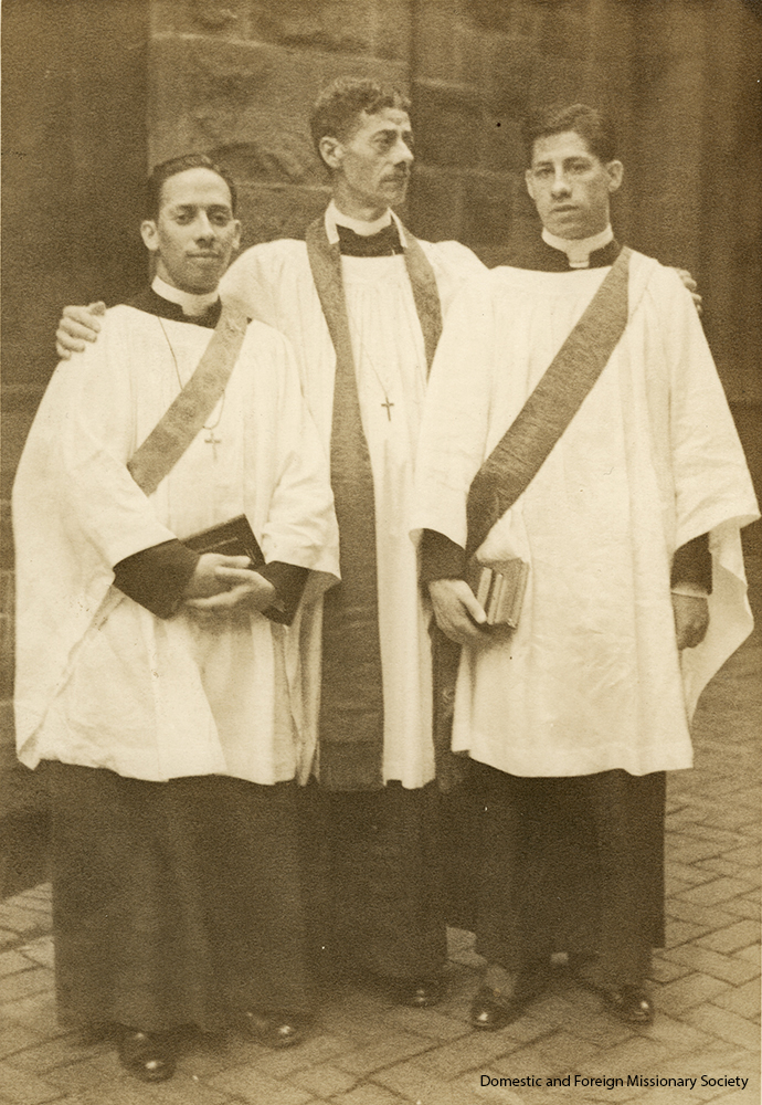 - Reverend John Logan stands with his sons, John Logan, Jr. (left) and Thomas Logan (right), at the Church of the Holy Apostles for the younger Logans' ordiantion to the diaconate, 1938.