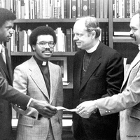 "Save the Children Weekend" receipts were presented to Presiding Bishop John M. Allin of the Episcopal Church for the Presiding Bishop's Fund for World Relief for world hunger. Designated to purchase two irrigation pumps for drought victims in Niger through Africare. Shown above (left to right) are Vaughn Simkins, youth coordinator of St. Cyprian's; the Rev. Richard L. Tolliver, rector; Bishop Alin ; and Robert Thornell, chairman of the church's world hunger committee.