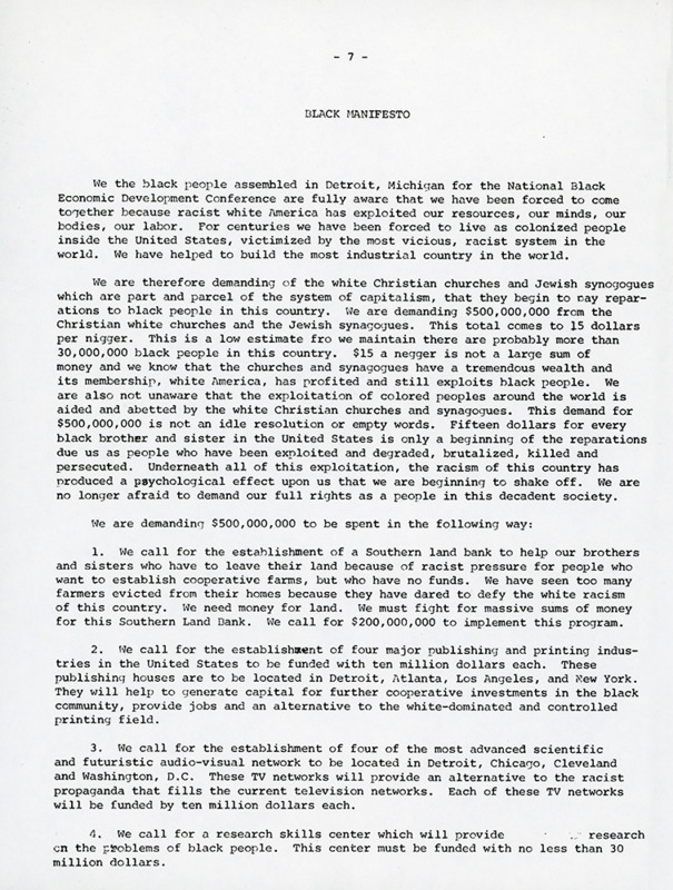 The Black Manifesto was a call for reparations from the white Christian churches and Jewish synagogues which, it argued, held tremendous wealth gained from the exploitation of Black people both within the United States and around the world. It suggested a starting sum of five hundred million dollars ($500,000,000), or fifteen dollars for each Black person in the United States. Among other projects the money would be used for the establishment of a Southern land bank; media industries; a training center for media communications; a Black university; and a National Black Labor Strike and Defense Fund.