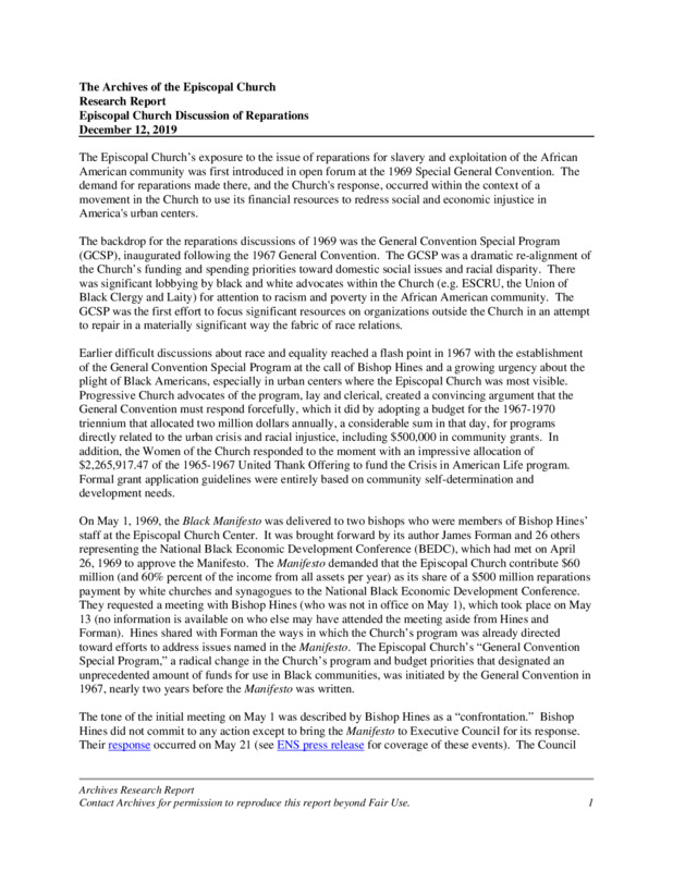 At the conclusion of the Black Economic Development Conference, Forman established a separate organization with the same name, commonly known by its abbreviation “BEDC.” He then set out to lobby for reparations from white churches and synagogues. Only days later, Forman took his efforts to New York City, where many denominations and ecumenical organizations were headquartered. On May 13, 1969, he met with Presiding Bishop Hines and presented his demands for The Episcopal Church: Sixty million dollars and an additional sixty percent per year of the income from all of the church’s assets.