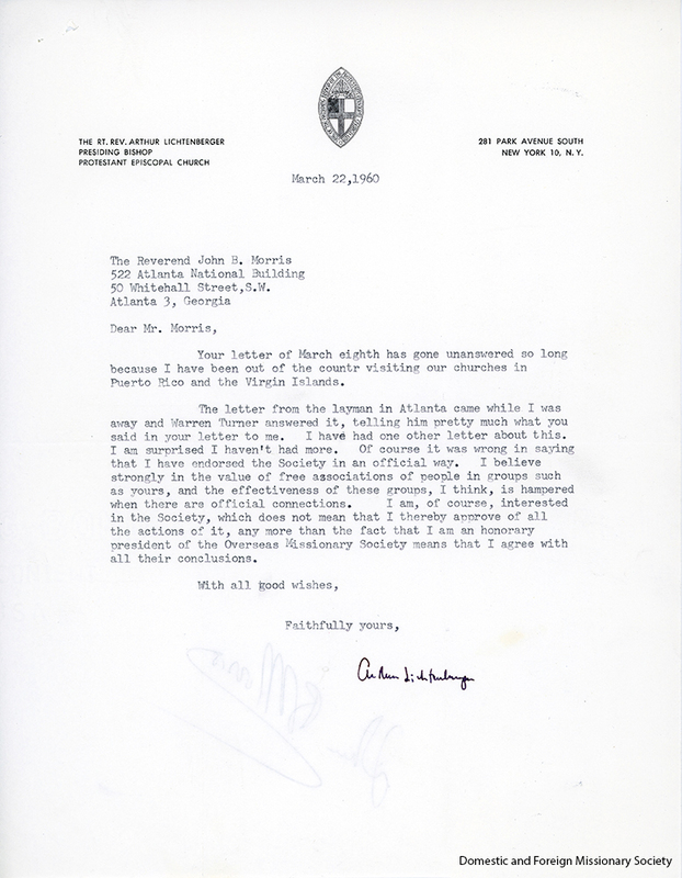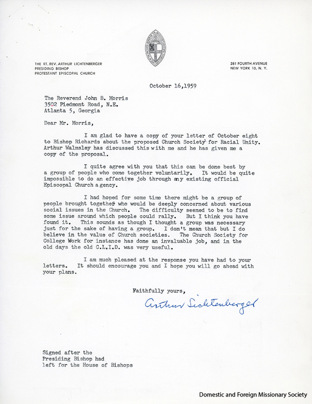 In December 1959, approximately one hundred lay and ordained Episcopalians responded to a call for meeting issued by the Reverends John Morris, Neil Tarplee, and Arthur Walmsley, to form an organization committed to removing all vestiges of segregation from the life of the church. The group adopted the name “Episcopal Society for Cultural and Racial Unity” and took issue with the de facto racial segregation that dominated church life, particularly in the South, which included refusing Black Americans admission to church-run institutions and to white worship services.