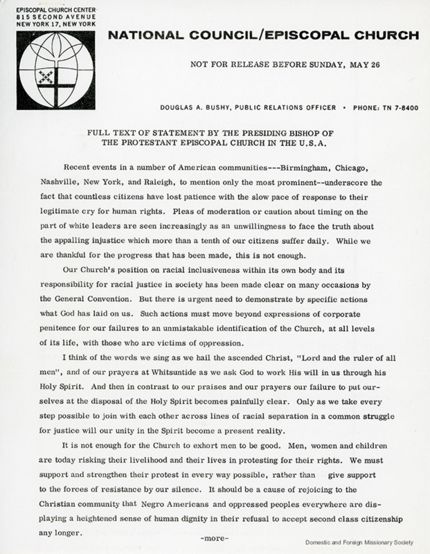 The group met on the campus of St. Augustine’s College in Raleigh, North Carolina, one of the ACIN colleges. By adopting many of the tactics used by other civil rights protesters, such as peaceful protest and civil disobedience, ESCRU sought to publicize long-standing problems of segregation and to promote racial unity and “harmony among peoples.” ESCRU wanted to awaken the consciousness of all Episcopalians and to call attention to the inequities in Episcopal schools, churches, and institutions.