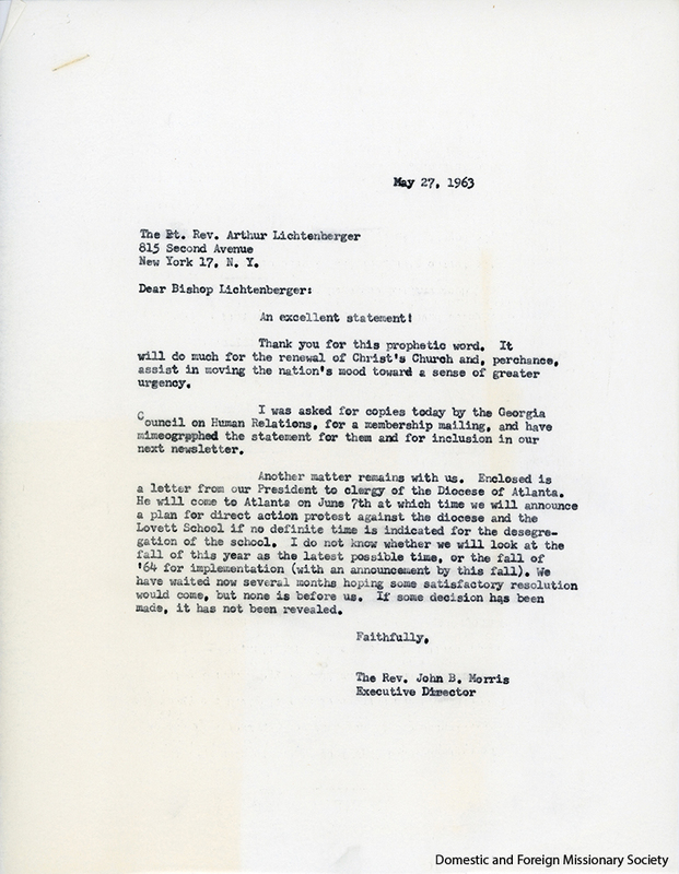 ESCRU’s membership grew from approximately 100 in 1959 to over 1,000 in 1961. At its peak in 1966, ESCRU counted 5,000 members in 29 chapters, of whom two-thirds were lay persons. Its strongest support was in northern urban areas, including Chicago, New York, and Boston, but chapters were also located in Georgia, Texas, and Maryland. ESCRU’s national office, which oversaw most of its outreach, was in Atlanta under the guidance of the Rev. John Morris, who served as Executive Director from 1960 to 1967.