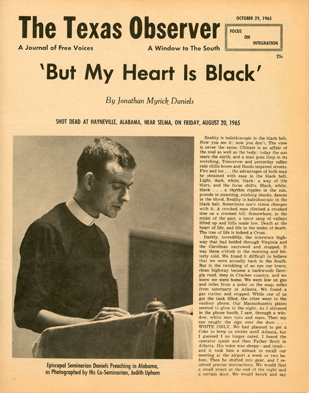 A seminarian from the Episcopal Theological School in Cambridge, Massachusetts and an ESCRU member, Jonathan Daniels worked closely with civil rights leaders during the Selma, Alabama demonstrations. Initially, Daniels had emphatically defended the position of Bishop Carpenter, Bishop of Alabama, who had announced that he would not welcome any civil rights workers in his state. Daniels backed the traditionalist position that placed greater emphasis on the bishop’s authority, and he opposed outsiders entering Alabama without the permission of the Bishop. He changed his mind when tensions and violence escalated, and he heard Martin Luther King Jr.’s call to clergy to join him in the march from Selma to Montgomery. In August of 1965, he returned to Selma on an assignment to assist in a voter-registration project in Lowndes County. Daniels explained his return to Selma saying, “something had happened to me in Selma, which meant I had to come back. I could not stand by in benevolent dispassion any longer without compromising everything I know and love and value. The imperative was too clear, the stakes too high, my own identity was called too nakedly into question...I had been blinded by what I saw here (and elsewhere), and the road to Damascus led, for me, back here.”