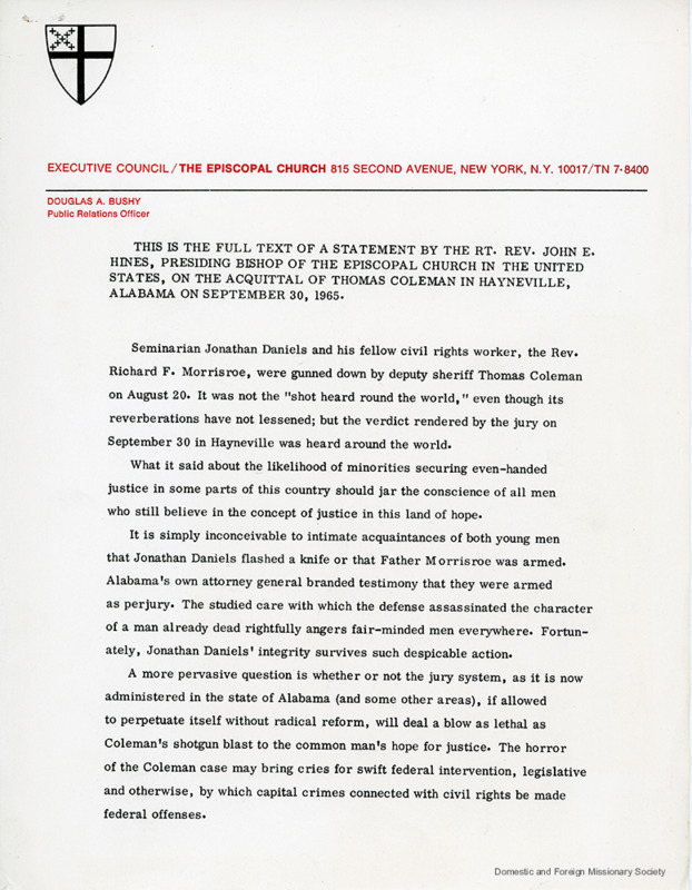 Members of ESCRU believed Thomas Coleman was wrongfully acquitted in Daniel’s death and that white juries would continue to fail to convict defendants charged with race and hate crimes. In response to Coleman’s acquittal, and those of other white defendants charged with killing civil rights workers, ESCRU joined the American Civil Liberties Union (ACLU), National Council of Churches and other groups in Operation Southern Justice, which brought lawsuits and a lobbying campaign to integrate southern juries. In response to these efforts, President Lyndon B. Johnson instructed the Justice Department to draft legislation to ensure fair jury selection in the South. This legislation was introduced to Congress as the Civil Rights Act of 1966. It passed the House, but failed to pass the Senate.