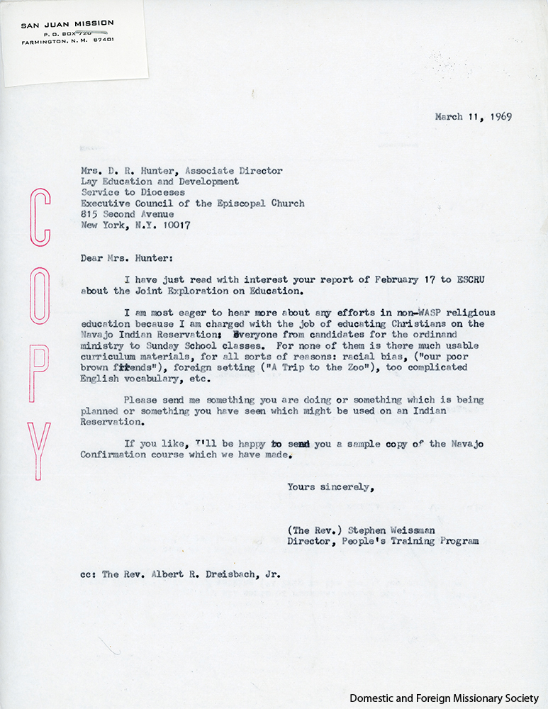 In late 1968, several ESCRU chapters contacted the Episcopal Church Center in New York about racist and outdated curricula on Africa that was distributed by the headquarters in connection with its long-established Lenten Mite Box Offering. These materials included pamphlets and brochures produced by the Department of Religious Education and a book published by the Friendship Press, the publishing arm of the National Council of Churches.