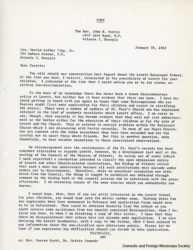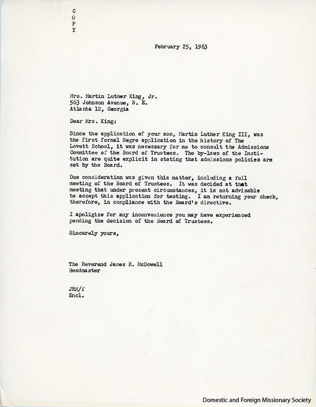 In the early 1960s, as members of the clergy from many denominations called for the full integration of public facilities across the South, including schools, the Lovett School found itself in the center of controversy. While the Lovett School had no formal policy regarding the race of students it admitted, The Episcopal Church had a policy that fully supported integration in public spaces. With that in mind, the Rev. John Morris, founder of ESCRU, whose daugher attended Lovett, suggested that the Rev. Martin Luther King, Jr. and his wife, Coretta, submit an application for their son, Martin Luther King III, in the spring of 1963. Stating that they were seeking out the best education for their son, the King family denied allegations that they were specifically trying to integrate the Lovett School or to cause social and political tension.