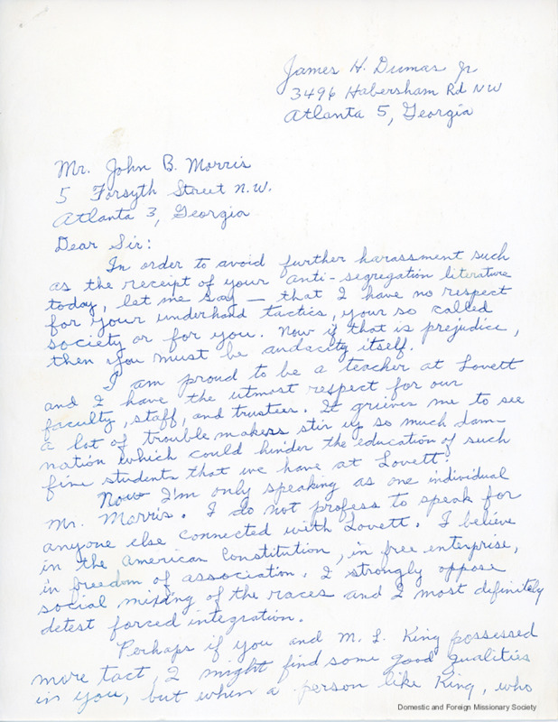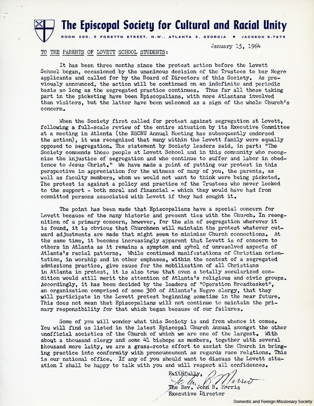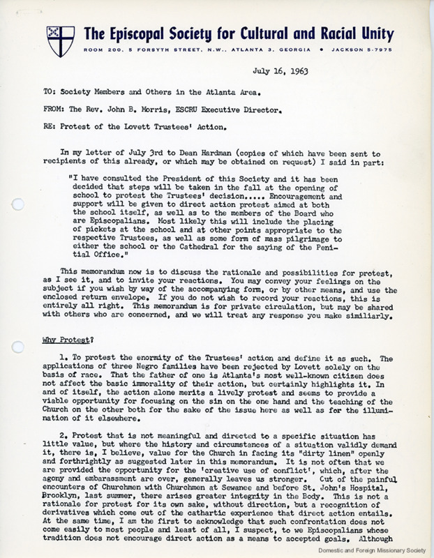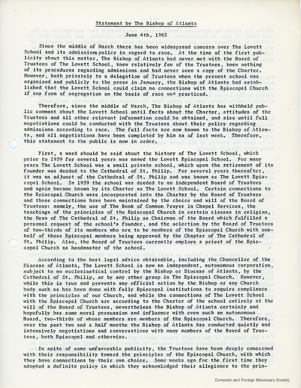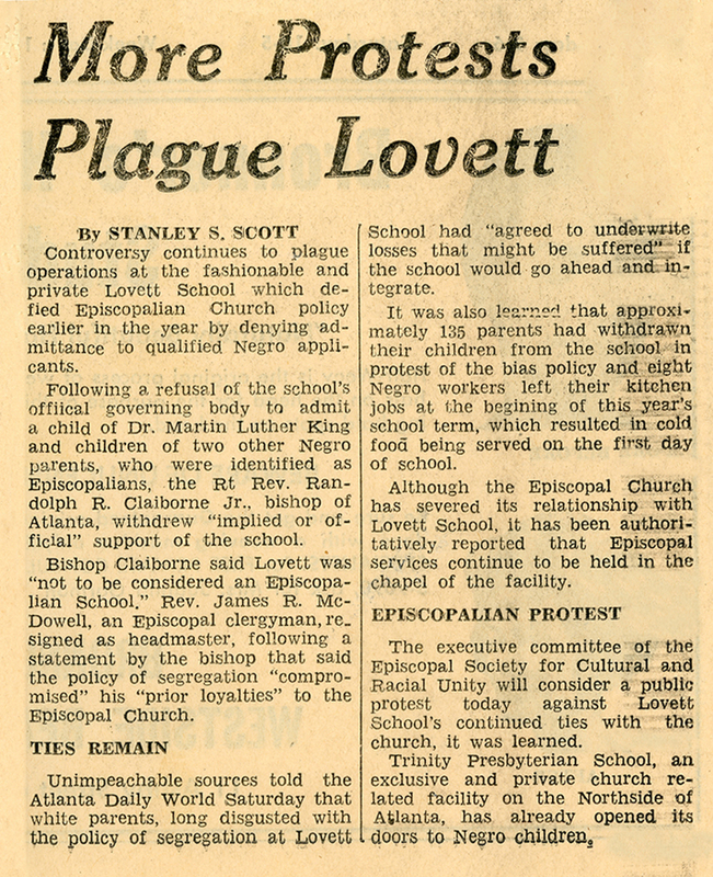 To prevent integration, the school board amended the Lovett School’s charter and by-laws, stating that they had no official ties to The Episcopal Church and as a private institution, they could continue to deny admittance of Black students. In response, the Bishop of Atlanta, Rt. Rev. Randolph Claiborne, issued a statement on July 1, 1963 advising that the Lovett School “is an independent, autonomous corporation, subject to no ecclesiastical control by the Episcopal Church,” and would no longer receive any implied or official support from The Episcopal Church. Despite the formal dissolution of support, the dean of St. Philip's Cathedral remained the chair of the board of the Lovett School and the provision requiring two-thirds of the board members to be Episcopalian remained in place. When John Morris publicly challenged Bishop Claiborne to uphold The Episcopal Church policy on desegregation, arguing that The Episcopal Church was still supporting the school by allowing the Baccalaureate services to be held at St. Philip’s Cathedral, holding Episcopal religious services, and enjoying the service of several prominent Episcopalians on the school’s Board of Trustees, Bishop Claiborne refused to discuss the matter further and Morris resigned his license to officiate within the Diocese of Atlanta in protest.