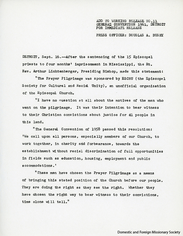 - A letter to Pilgrim Priests after the arrest from ESCRU Director John Morris, October 18, 1961.
