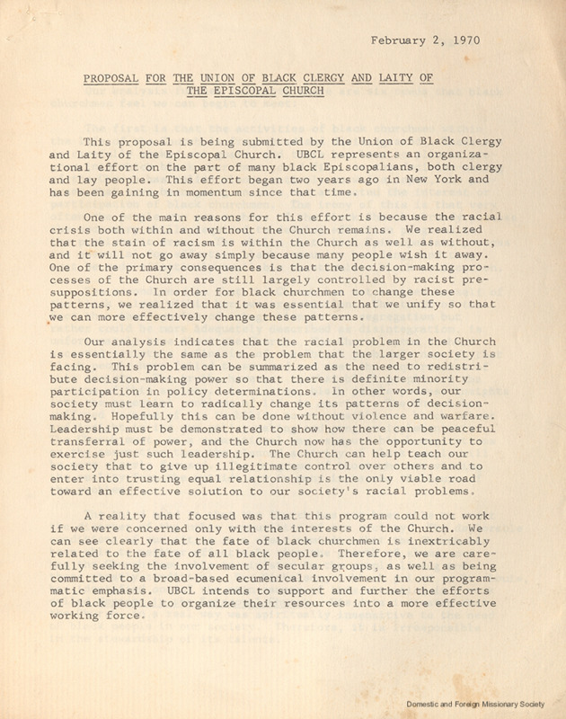 In April 1967, a group of Black Episcopal priests published an open letter to Presiding Bishop Hines in The Episcopalian to protest discrimination in hiring, placement, and deployment of Black clergy. Despite the resolutions of General Convention and the number of qualified Black Episcopalians available, few Black clergy and laity had reached administrative positions at the diocesan or church-wide levels. Few Black professors had been hired at theological schools. And the Joint Urban Board of the Home Department, responsible for parishes and missions in the inner cities, had no Black members at all. A year later, in February 1968, seventeen Black priests, among the signatories of the letter, met at St. Philip’s Church in Harlem and established the Union of Black Clergy and Laity (UBCL) to fight for respect for Black Episcopalians and their full-participation in church governance.