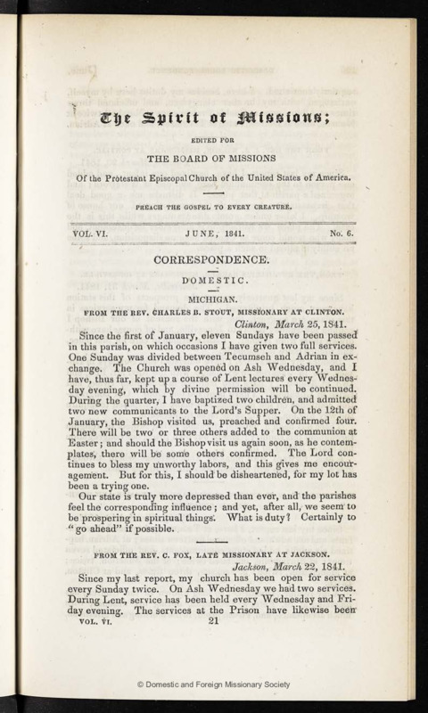 - The Spirit of Missions, June 1841. A missionary letter gives thanks for prayer books provided by the Female Prayer Book Society of Philadelphia.