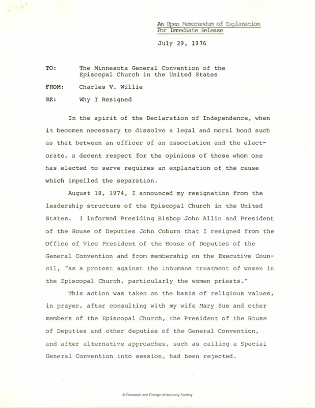 - Charles Willie's Statement, 1976. Charles Willie’s statement to the 1976 General Convention, explaining why he resigned over the censure of those involved in the ordination service in Philadelphia.