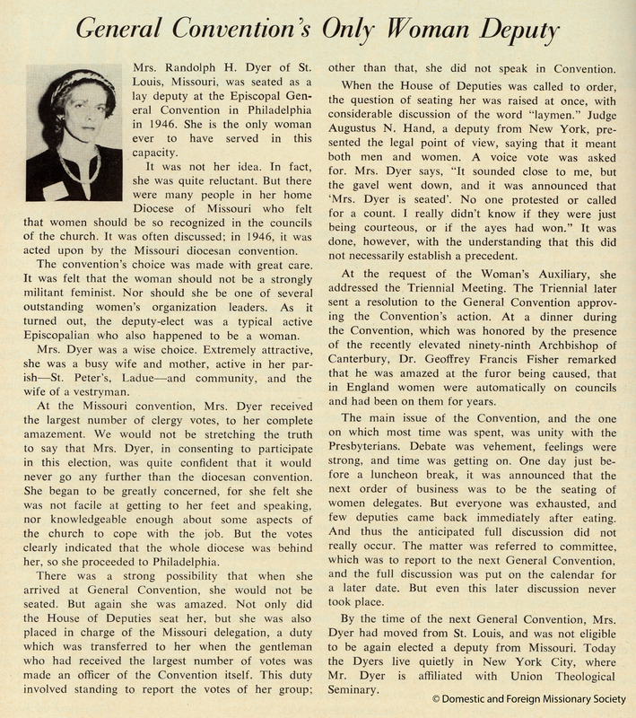 - A profile of Mrs. Dyer from the February 1964 issue of The Episcopalian looks back at the day she was seated, and the history of women in the House of Deputies thereafter.